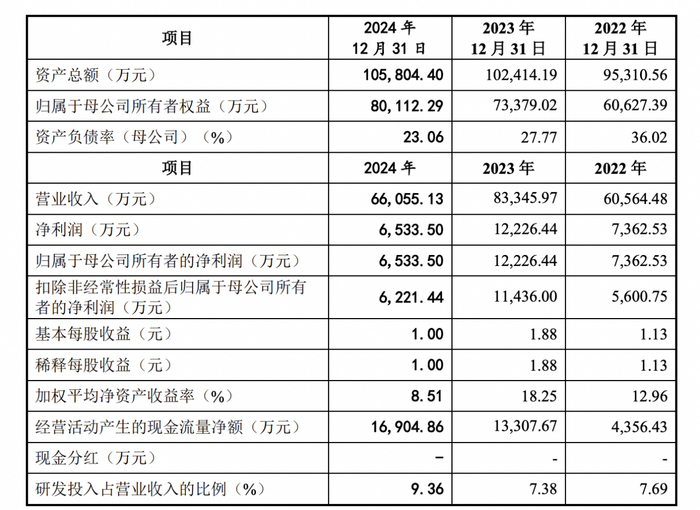 2022年至2024年,海创光电营收分别为6.06亿元、8.33亿元、6.61亿元;净利润分别为7362.53万元、1.22亿元、6533.5万元;主营业务毛利率分别为32.07%、35.85%、31.06%。