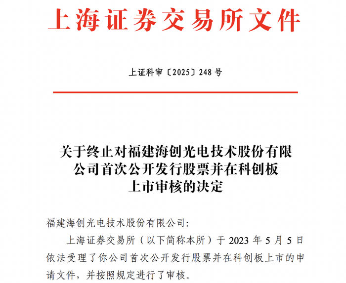瑞财经 刘治颖近日,上交所决定终止对福建海创光电技术股份有限公司(以下简称:海创光电)首次公开发行股票并在科创板上市的审核,保荐机构为兴业证券,保荐代表人为陈水平、陈霖,会计师事务所为立信。