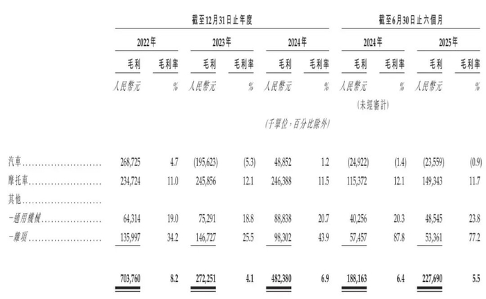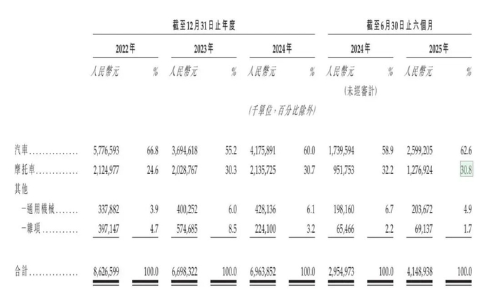 2022年-2025年上半年,千里科技的收入分别为86.27亿元、66.98亿元、69.64亿元及41.49亿元,其中来自汽车的收入占比分别为66.8%、55.2%、60.0%及62.6%,来自摩托车的收入分别为24.6%、30.3%、30.7%及30.8%。