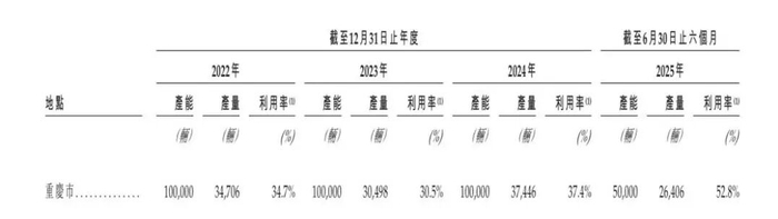 千里科技现有的睿蓝制造设施位于重庆市,该厂的产能为每年10万辆,而2022年-2025年上半年,产量分别为34,706辆、30,498辆、37,446辆、26,406辆。产能利用率分别为34.7%、30.5%、37.4%、52.8%。