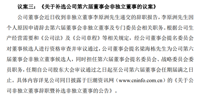 10月28日,中青宝发布公告,称公司董事会近日收到非独立董事李原洲递交的辞职报告,李原洲因个人原因申请辞去第六届董事会非独立董事及专门委员会相关职务。董事会提名梁海栋为第六届董事会非独立董事候选人,同时担任第六届董事会提名委员会、战略委员会委员职务,任期自公司股东大会审议通过之日起至公司第六届董事会任期届满之日止。