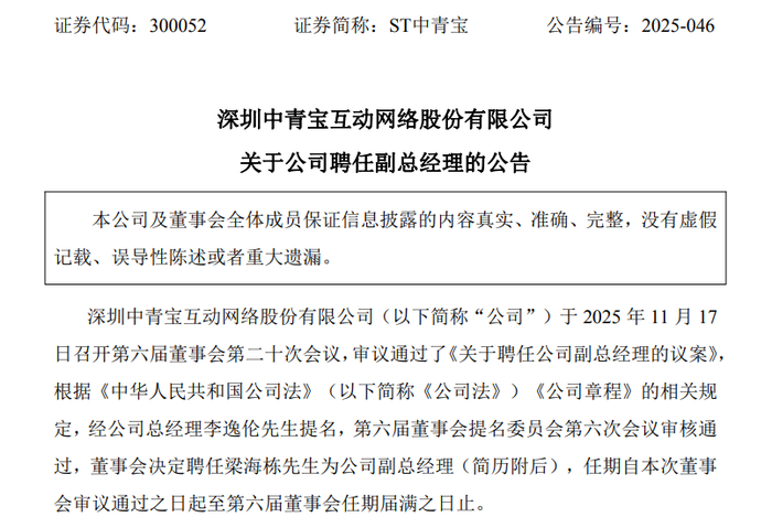 公告显示,中青宝当日召开第六届董事会第二十次会议,审议通过《关于聘任公司副总经理的议案》。经公司总经理李逸伦提名,第六届董事会提名委员会第六次会议审核通过,董事会决定聘任梁海栋为公司副总经理,任期自本次董事会审议通过之日起至第六届董事会任期届满之日止。
