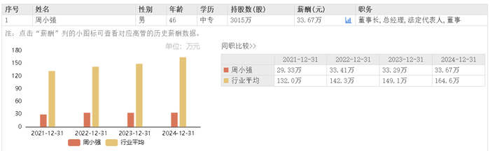据东方财富网数据,博实结董事长兼总经理周小强2024年所获薪酬为33.67万元,相较上年薪酬33.29万元微涨。