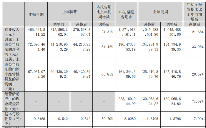 其中第三季度,博实结营业收入为4.67亿元,同比增长24.31%;归母净利润为7269.05万元,同比增长64.42%;扣非归母净利润为6703.71万元,同比增长65.81%;基本每股收益0.82元。