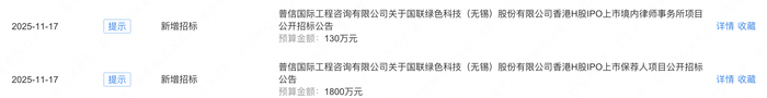 其中一份招标文件显示,本次招标配合招标人完成香港联交所港股IPO上市成功发行目标所需的境内律师事务所服务。服务期自合同签订生效之日起,至招标人港股IPO上市工作全部结束或项目完成交割或协议提前终止之日后3个月止。预算及最高限价为130万元。