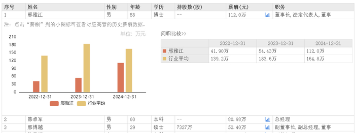 据东方财富网数据,金花股份董事长邢雅江2024年所获薪酬为112万元,相较上年薪酬54.43万元涨薪105.77%;副董事长、副总经理邢博越2024年领薪52.40万元。