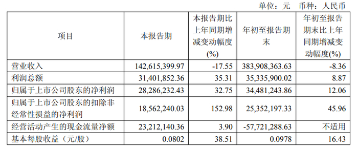 其中第三季度,金花股份营业收入为1.43亿元,同比下降17.55%;归母净利润为2828.62万元,同比增长32.75%;扣非归母净利润为1856.22万元,同比增长152.98%;基本每股收益0.08元。