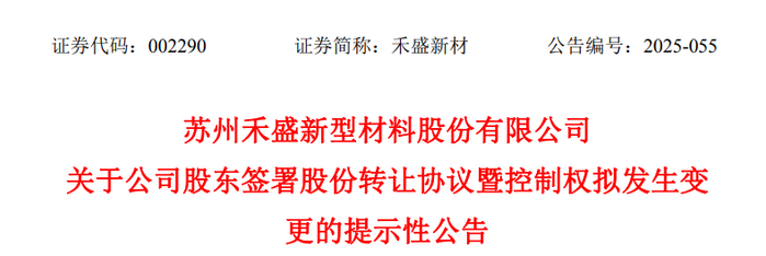 公告显示,禾盛新材公司控股股东、实际控制人赵东明及其一致行动人蒋学元、股东上海泓垣盛新能源科技合伙企业(有限合伙)于11月20日签署《关于苏州禾盛新型材料股份有限公司之股份转让协议》,拟以协议转让方式向上海摩尔智芯信息科技合伙企业(有限合伙)转让4466.022万股股份,占公司总股本的18.00%,转让价格为33.71元/股,价款总额达15.05亿元。本次交易完成后,摩尔智芯将持有禾盛新材18.00%股份,成为控股股东,实际控制人变更为谢海闻。赵东明及其一致行动人持股降至3403.29万股,占比13.72%,并放弃1488.67万股(占总股本6%)的表决权。