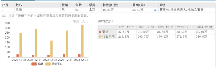 据东方财富网数据,禾盛新材董事长梁旭2024年领薪32.4万元,相较2023年未涨薪。