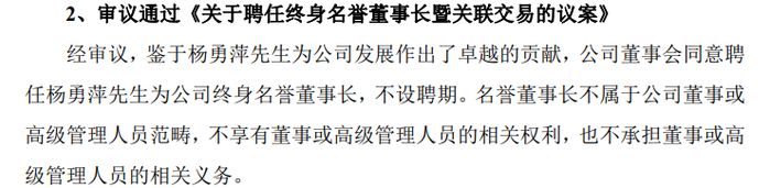 同日,雪榕生物董事会审议通过了《关于聘任终身名誉董事长暨关联交易的议案》,聘任杨勇萍为公司名誉董事长。