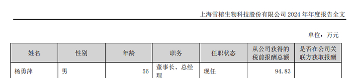 据雪榕生物2024年年报,杨勇萍2024年领薪94.83万元。