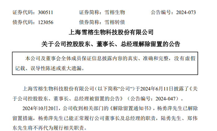 2024年10月21日,雪榕生物发布公告,公司于当年6月11日披露了《关于公司控股股东、董事长、总经理被留置的公告》。2024年10月20日,公司收到相关部门的《解除留置通知书》,杨勇萍已解除留置措施,已能正常履职。