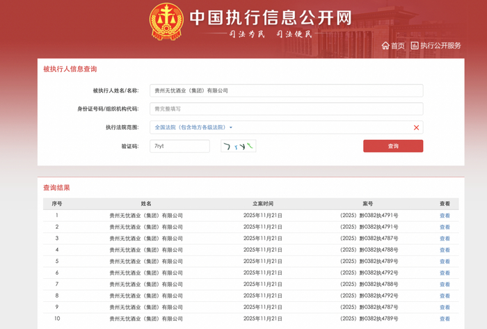 瑞财经 刘治颖 11月21日,贵州仁怀市人民法院向贵州无忧酒业(集团)有限公司(以下简称:无忧酒业)发出(2025)黔0382执4787号—4792号文书(共6份连续执行文书),执行标的合计6255.51万元。