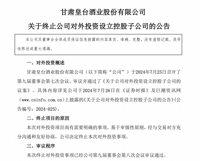 2024年7月25日,皇台酒业公告,拟与无忧酒业共同出资3000万元设立控股子公司,主要业务为白酒酿造销售、酒类进出口贸易;绿色产业开发、酿酒原料购销,其中皇台酒业占股55%,无忧酒业占股45%。仅7天后以“审慎性原则”紧急终止合作。