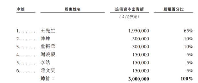 成立时,天瞳威视的注册资本为300万元,当时共有六名股东,包括王曦、陈坤、卢振华、谢晓靓、李皓及蒋文昊。其中,王曦持股65%。