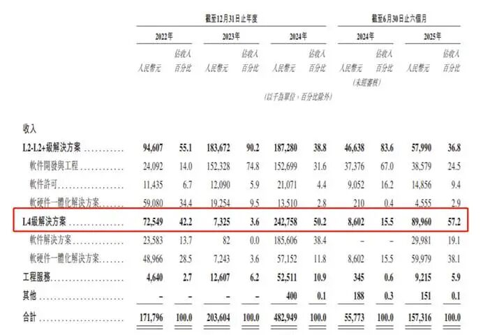 2024年及2025年上半年,公司从L4级解决方案产生收入分别为2.43亿元及0.90亿元,占公司总收入的一半以上。