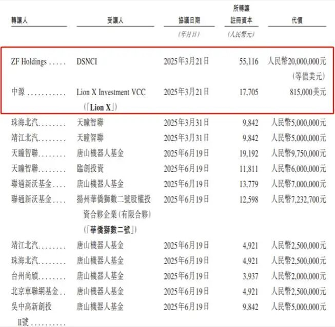 今年3月,采埃孚全资子公司ZF Holdings向DSNCI转让股权,作价为2000万元。