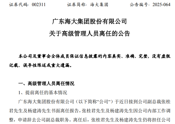 公告显示,广东海大集团股份有限公司近日接到副总裁张桂君及杨建涛书面离任报告,二人因公司内部工作调整,申请辞去公司副总裁职务,离任后仍将担任公司其他职务。二人原定任期至公司第七届董事会任期届满之日,其离任报告自送达公司之日生效。