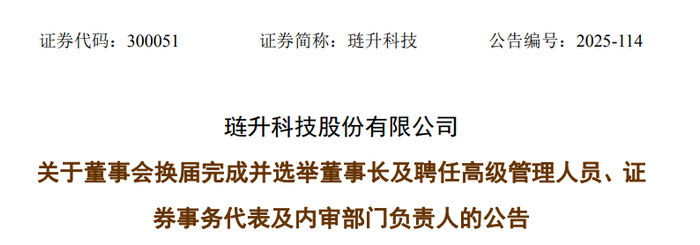 瑞财经 钟鸣辰 11月26日晚,琏升科技(SZ300051)发布换届公告,董事长黄明良、副董事长朱江等辞任,新任董事长王新上任。
