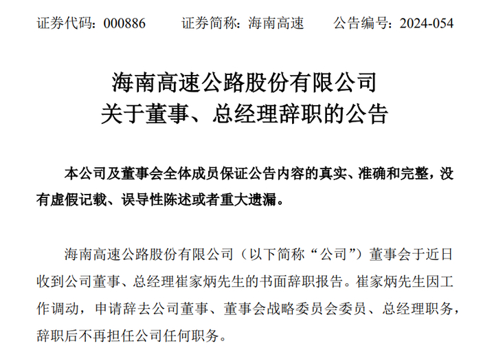 2024年11月7日,海南高速发布公告,公司董事会于近日收到公司董事、总经理崔家炳的书面辞职报告。崔家炳因工作调动,申请辞去公司董事、董事会战略委员会委员、总经理职务,辞职后不再担任公司任何职务。