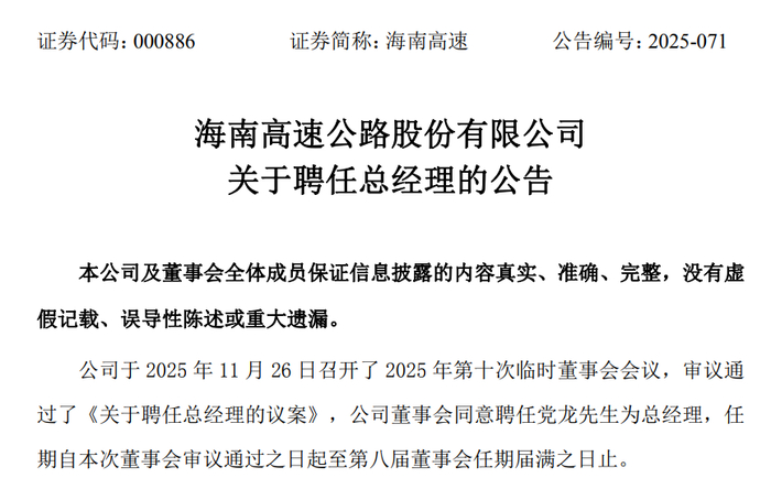 公告显示,海南高速公路股份有限公司当日召开2025年第十次临时董事会会议,审议通过《关于聘任总经理的议案》,同意聘任党龙为总经理,任期自本次董事会审议通过之日起至第八届董事会任期届满之日止。