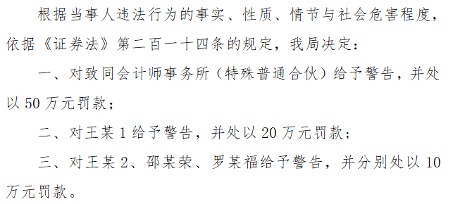 监管认定,致同所在该项目中未按规定保存审计底稿,并在收到监管调取通知后对底稿进行修改、补作和毁损,对其给予警告并处以50万元罚款,对四名签字会计师分别处以10万元至20万元不等罚款。