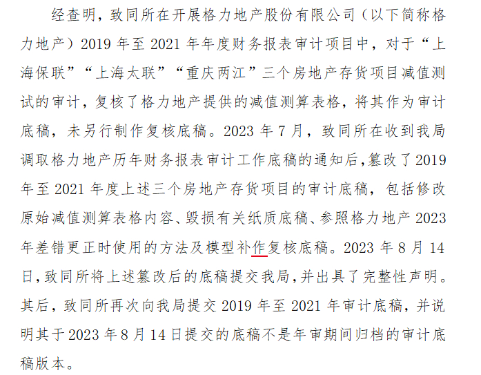 2023年7月,致同所在收到广东证监局调取格力地产历年财务报表审计工作底稿的通知后,篡改了2019年至2021年度上述三个房地产存货项目的审计底稿,包括修改原始减值测算表格内容、毁损有关纸质底稿、参照格力地产2023年差错更正时使用的方法及模型补作复核底稿。2023年8月14日,致同所将上述篡改后的底稿提交广东证监局,并出具了完整性声明。