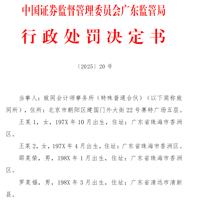 瑞财经 王敏 11月26日,广东证监局披露对致同会计师事务所(以下简称“致同所”)的行政处罚决定,指向格力地产股份有限公司(以下简称“格力地产”)2019至2021年年报审计项目。