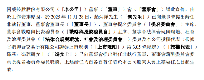公告显示,由于工作安排原因,赵炳祥已向国药控股董事会提出辞任非执行董事、董事长、提名委员会主席、战略与投资委员会主席、法律合规与环境、社会及治理委员会委员及公司授权代表职务;冯蓉丽已向董事会提出辞任非执行董事、薪酬委员会委员及提名委员会委员职务,上述辞任均自各自替任者于公司股东大会上获委任之日起生效。