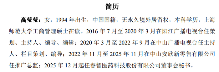 高莹莹,女,1994 年出生,中国国籍,无永久境外居留权,本科学历,上海师范大学工商管理硕士在读。2016 年 7 月至 2020 年 3 月在阳江广播电视台任策划、主持人、编导、编辑;2020 年 3 月至 2022 年 9 月在中山广播电视台任主持人、栏目策划、编导;2022 年 11 月至 2025 年 11 月在中山安欣新零售有限公司任推广总监;2025 年 12 月起任睿智医药科技股份有限公司董事会秘书。
