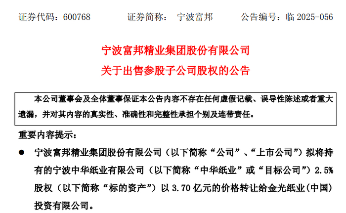 本次交易前,宁波富邦持股2.5%;交易后,将不再持有其股权。2024年度,中华纸业资产总额338.68亿元,负债总额171.46亿元,净资产91.51亿元,营业收入116.08亿元,归母净利润4.50亿元。本次交易定价以评估结果为依据,采用市场法对中华纸业2.5%股权在2024年12月31日的市场价估值为3.71亿元,经双方协商,交易价格确定为3.70亿元。