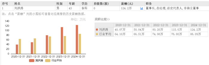 据东方财富网数据,英派斯董事长兼总经理刘洪涛2020-2024年分别领薪40.07万、50.04万、80.2万、115万和124.2万元,近五年涨薪幅度达209.96%。