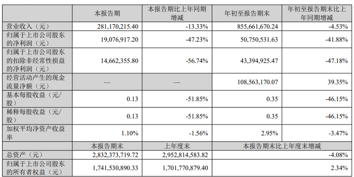 报告显示,英派斯公司前三季度营业收入为8.56亿元,同比下降4.53%;归母净利润为5075.05万元,同比下降41.88%;扣非归母净利润为4339.49万元,同比下降47.18%;基本每股收益0.35元。