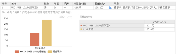 据东方财富网数据,睿智医药董事长兼CEO WOO SWEE LIAN(胡瑞连)2024年所获薪酬为120.1万元。