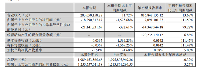 报告显示,睿智医药公司前三季度营业收入为8.17亿元,同比增长13.68%;归母净利润为709.13万元,同比增长111.50%;扣非归母净利润为-1434.95万元,同比增长79.22%;基本每股收益0.01元。