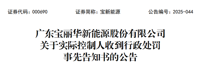 公告显示,广东宝丽华新能源股份有限公司实际控制人叶华能于12月2日收到中国证监会广东监管局下发的两份《行政处罚事先告知书》, 处罚书内容如下: