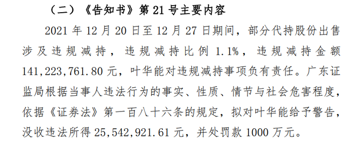 2021年12月20日至12月27日期间,部分代持股份出售涉及违规减持,违规减持比例1.1%,违规减持金额1.41亿元,叶华能对违规减持事项负有责任。广东证监局拟对叶华能给予警告,没收违法所得2554.29万元,并处罚款1000万元。