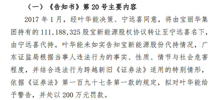 2017年1月,经叶华能决策、宁远喜同意,将宝丽华集团持有的1.11亿股宝新能源股权协议转让至宁远喜名下代持,叶华能未如实告知宝新能源股份代持情况。广东证监局拟对叶华能给予警告,并处以200万元罚款。同时,因未如实告知上述股份代持情况,广东证监局也对宁远喜下发了《行政处罚事先告知书》。