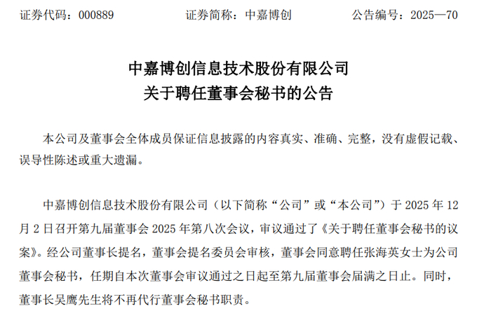 公告显示,中嘉博创信息技术股份有限公司当日召开第九届董事会2025年第八次会议,审议通过《关于聘任董事会秘书的议案》。经公司董事长提名,董事会提名委员会审核,董事会同意聘任张海英为公司董事会秘书,任期自本次董事会审议通过之日起至第九届董事会届满之日止,同时董事长吴鹰不再代行董事会秘书职责。