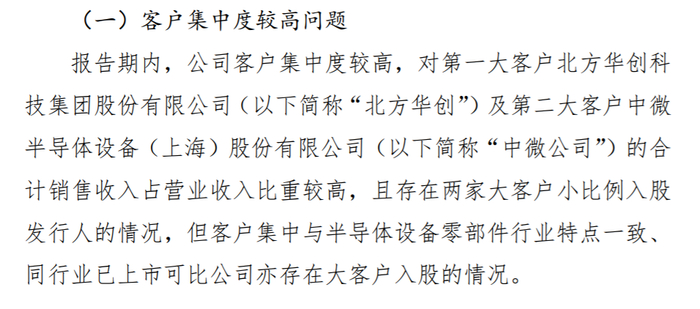 报告期内,公司客户集中度较高,对第一大客户北方华创科技集团股份有限公司(以下简称“北方华创”)及第二大客户中微半导体设备(上海)股份有限公司(以下简称“中微公司”)的合计销售收入占营业收入比重较高,且存在两家大客户小比例入股托伦斯的情况,但客户集中与半导体设备零部件行业特点一致、同行业已上市可比公司亦存在大客户入股的情况。