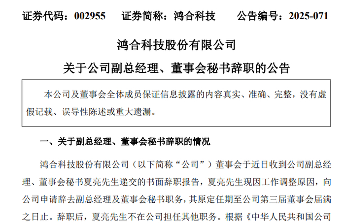 公告显示,鸿合科技股份有限公司董事会近日收到副总经理、董事会秘书夏亮的书面辞职报告。夏亮因工作调整原因,申请辞去副总经理及董事会秘书职务,原定任期至公司第三届董事会届满之日止,辞职后不在公司担任其他职务,辞职报告自送达公司董事会之日起生效。截至公告披露日,夏亮持有公司股份10.8万股,不存在应履行而未履行的承诺事项。