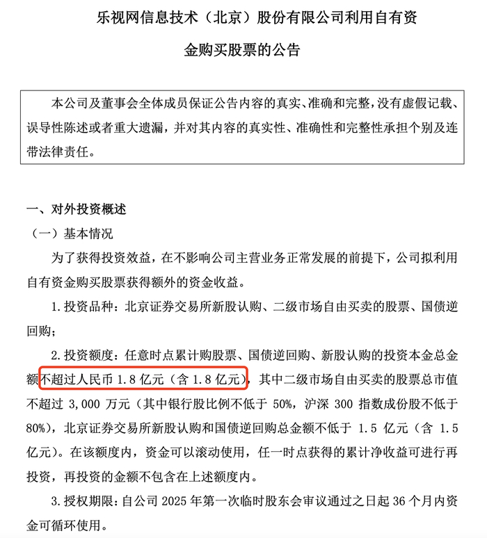 其投资品种为北京证券交易所新股认购、二级市场自由买卖的股票、国债逆回购;投资额度为任意时点累计购股票、国债逆回购、新股认购的投资本金总金额不超过1.8亿元(含1.8亿元);授权期限自公司2025年第一次临时股东会审议通过之日起36个月内资金可循环使用。