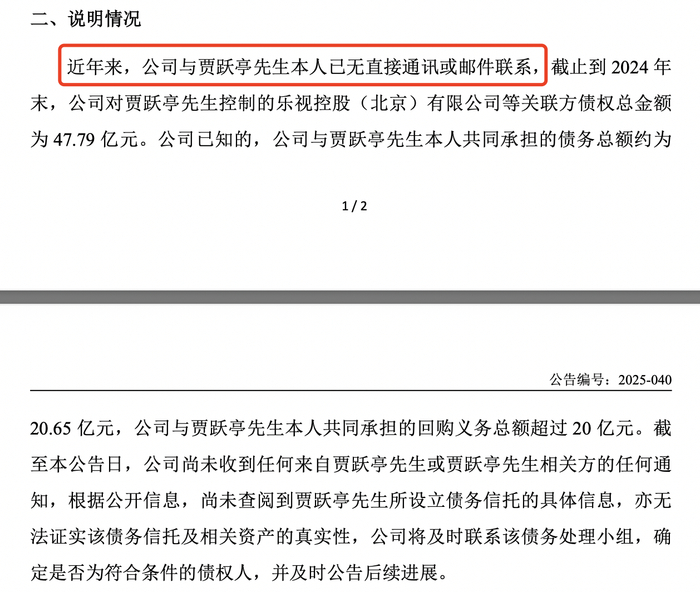 值得一提的是,乐视网由贾跃亭创立,不过其在11月20日的公告中称,近年来,公司与贾跃亭本人已无直接通讯或邮件联系。