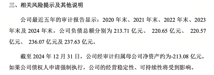 另外,最近五年的审计报告显示:2020年末、2021年末、2022年末、2023年末及2024年末,公司负债总额分别为213.71亿元、220.65亿元、220.57亿元、236.07亿元及237.63亿元。