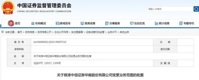 另外,2025年6月,证监会核准中信华南变更业务范围,减少证券保荐业务,同时将融资融券业务范围限定在“广东省除深圳市以外区域、广西壮族自治区、海南省、云南省、贵州省”。
