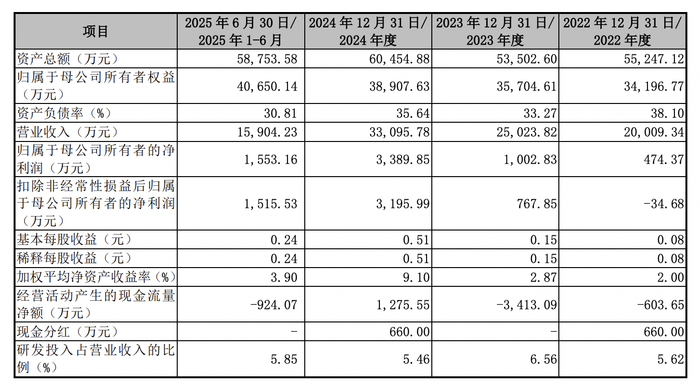2022年-2024年及2025年上半年,中科科化营业收入分别为2亿元、2.5亿元、3.31亿元和1.59亿元,归母净利润分别为474.37万元、1002.83万元、3389.85万元及1553.16万元。