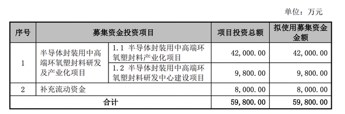 本次IPO,中科科化拟募资5.98亿元,将用于半导体封装用中高端环氧塑封料研发及产业化项目、补充流动资金。