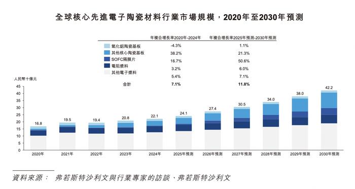 展望未来,全球核心先进电子陶瓷材料市场趋势预期将紧密围绕高性能化与新兴应用深化。随着高性能基板材料在功率电子、汽车电驱及高速通信领域的应用,产业正朝着更高导热性、更强可靠度与更高功率密度方向演进。此外,AI、物联网以及新能源等前沿科技领域的快速增长正在释放新的需求,为先进电子陶瓷材料开辟更广阔的应用空间。全球市场预计将从2025年的241亿元增长至2030年的422亿元,期间年复合增长率达11.8%。