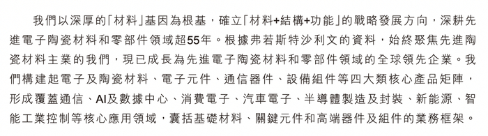 公司构建起电子及陶瓷材料、电子元件、通信器件、设备组件等四大类核心产品矩阵,形成覆盖通信、AI及数据中心、消费电子、汽车电子、半导体制造及封装、新能源、智能工业控制等核心应用领域,囊括基础材料、关键元件和高端器件及组件的业务框架。