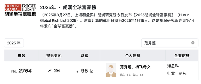 范秀莲身上贴着多个标签,包括“沈阳女首富”、“华南理工学霸”、“医药女王”。据《2025胡润全球富豪榜》,范秀莲、杨飞母女以95亿元财富位列榜单第2764位。
